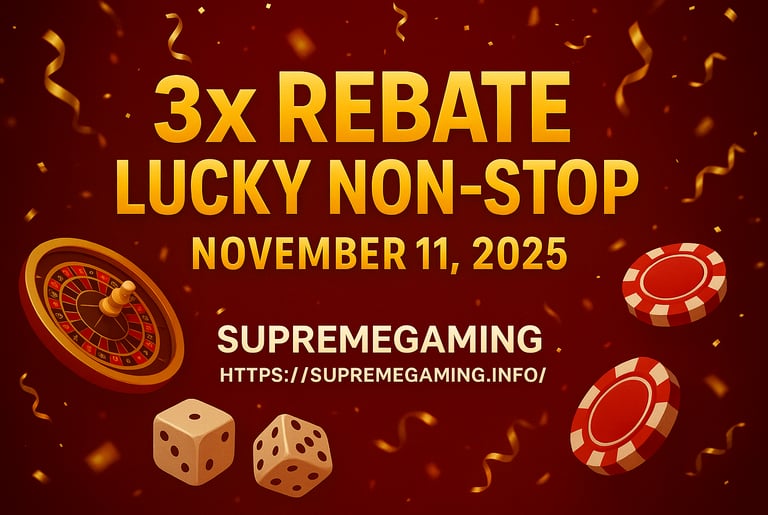 The 3x Rebate Lucky Non-Stop Event is more than just a promo — it’s a reflection of SUPREMEGAMING's promise to continuously elevate the gaming experience for its community. November 11, 2025 will go down as one of the most rewarding dates of the year, where fortune truly favors those who play smart, stay active, and enjoy every spin.